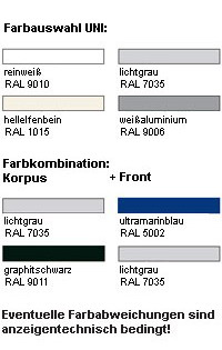 -Auszüge mit geschlossenem Boden -Hochwertige Kugelführung (optional bis 90 kg) -Doppel-Auszugssperre -Zentralverriegelung per Dreh-Zylinderschloss mit Wechselkern -Durchgehende Beschriftungsleiste -Pro Karteibahn 2 Schwingstützen inkl. -mit Höhenausgleichsschrauben ausgestattet -Belastung je Auszug bis 75 kg -Selbsteinzug mit Dämpfung Farbauswahl Uni: -reinweiß RAL 9010, lichtgrau RAL 7035, hellelfenbein RAL 1015, weißaluminium RAL 9006 Farbkombination: -Korpus - lichtgrau RAL 7035, graphitschwarz RAL 9011 -Front - ultramarinblau RAL 5002, lichtgrau RAL 7035 Bitte bei Bestellung angeben!